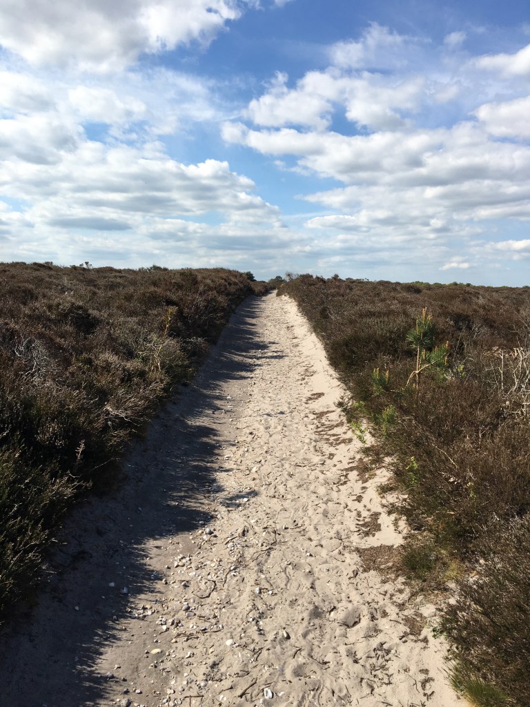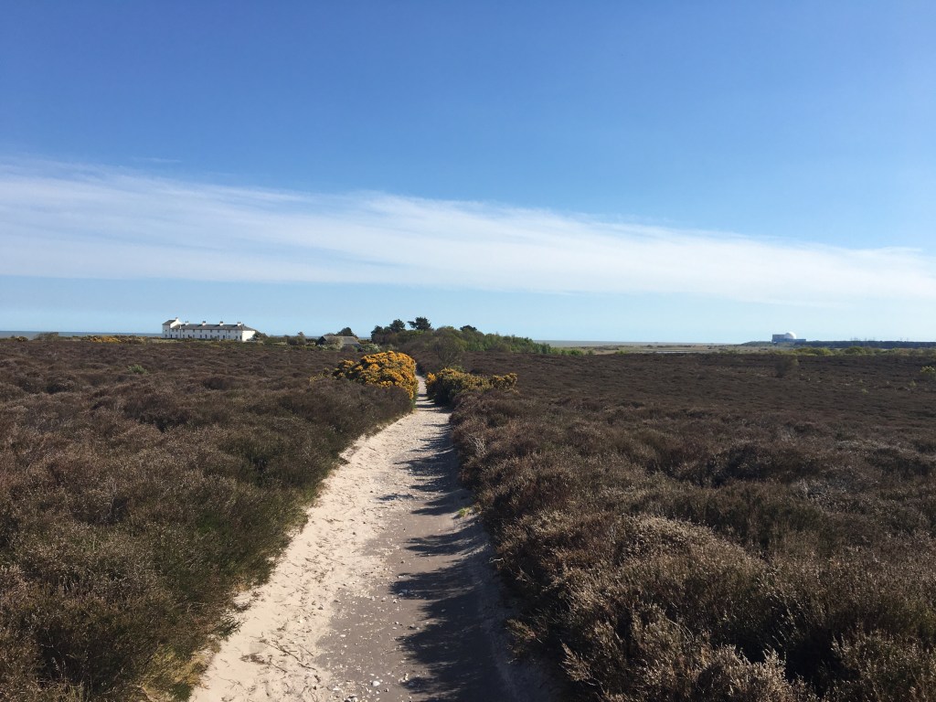 A National Trust sign indicates this is the start of Dunwich Heath which must stretch for some way North of here. The land rises inland, not by much (this is Suffolk after all) but the path curves up the small cliff (Minsmere Cliffs). Looking back I look at Sizewell and think back before that to Thorpeness, Aldeburgh, the Alde estuary, Burrow Hill and all the way back to Bawdsey when I started this odd odyssey, before Dad died, before Covid and lockdown, before so much change.