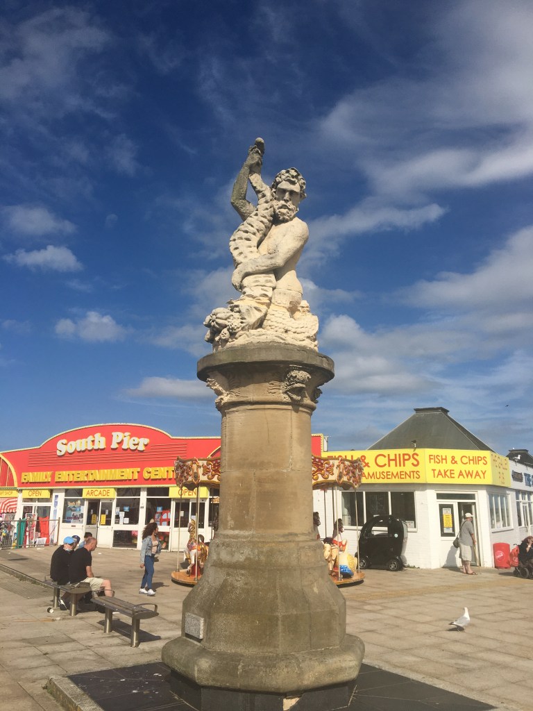 Without even realising it I am at the end. At South Pier. I mill about and for a while I appear at a loss as to where to go. I look at the amusements. I stare into the worn old eyes of the second triton, he so mighty but somehow reduced, holding forth in front of the amusements and the fish and chip shops.