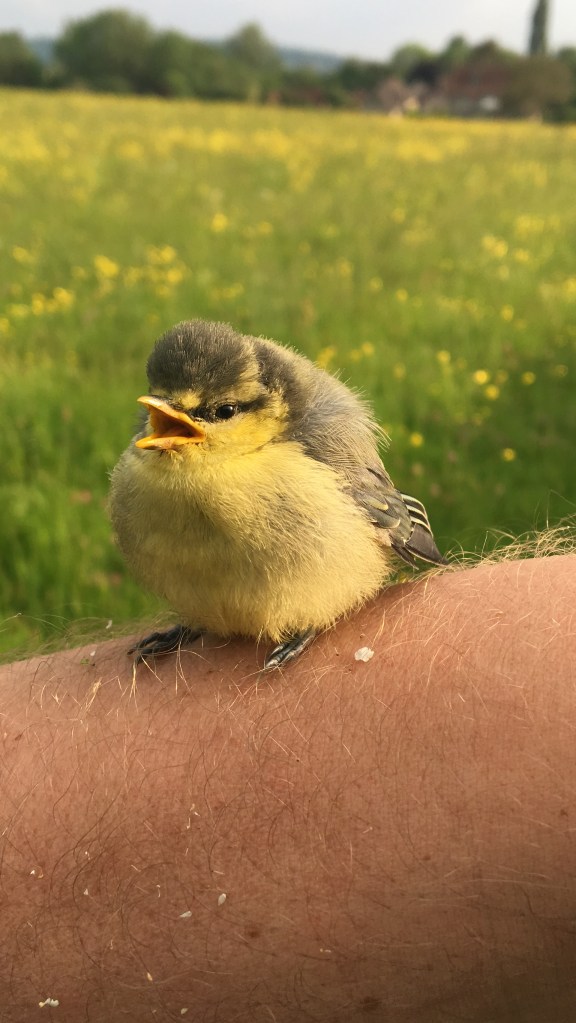 A little ball of fluff is perched on my forearm. It’s yellow like the field behind it. It’s a baby blue tit. It sits there for at least 2 minutes turning its head from side to side and cheaping the same shrill notes every 10 seconds or so. It has the recognisable urgency of a baby calling for its mother. When it opens its beak to sing I can see its throat is bright orange like an open flower. I throw it in the air and it flies confidently into the nearest tree.