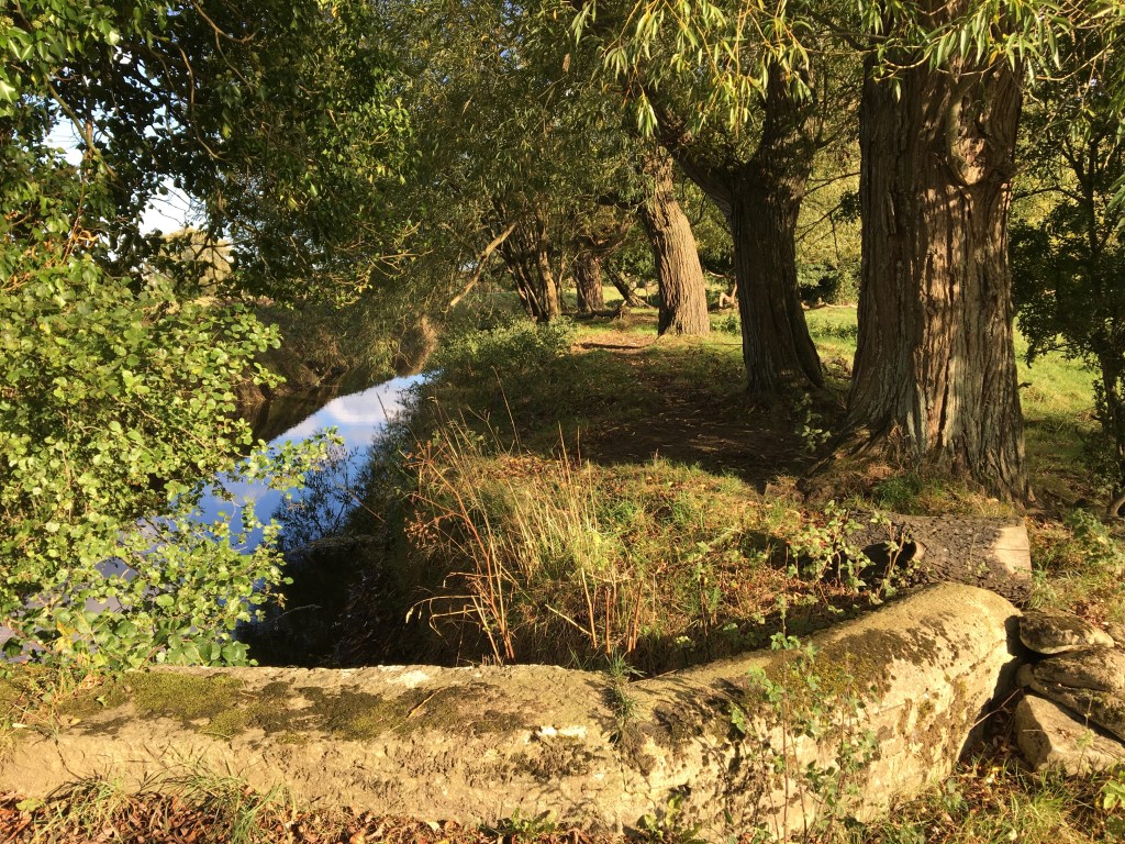 Across fields. All is green and flat with the thin lines of rhines reflecting the white of the sky. This is a scene unique to Somerset; water courses everywhere. Little weirs and locks. Crumbling concrete dams. Old wheels and screws to work the locks.