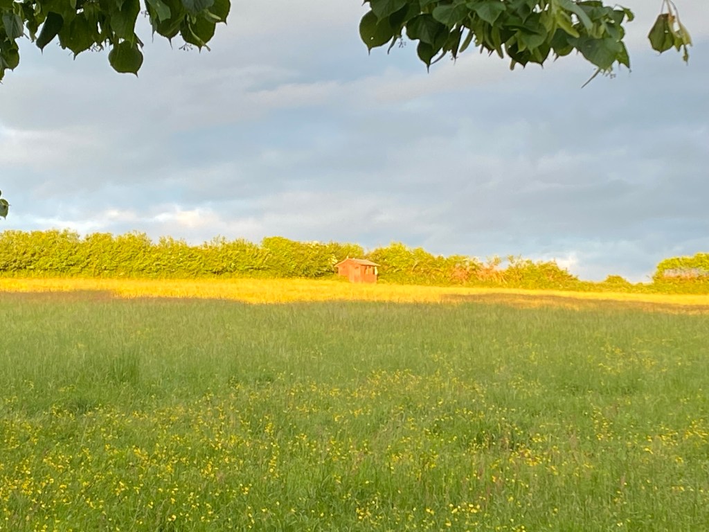 I wake up in a meadow just outside Misterton. Crows are fussing loudly above my head. Caw. Caw. There’s something urgent about them. Then the soft lilting of pigeons. There are minor changes every minute. There’s a Scots pine above me and the first light is amongst the branches like a fire that is just starting. A shower of elderflower catches the sunlight, turning the white splashes to peach. I’m outside Crewkerne and an early train is passing. It makes a gentle oooo like the hooting of the owl. It’s a small dawn chorus. It’s 5.30.