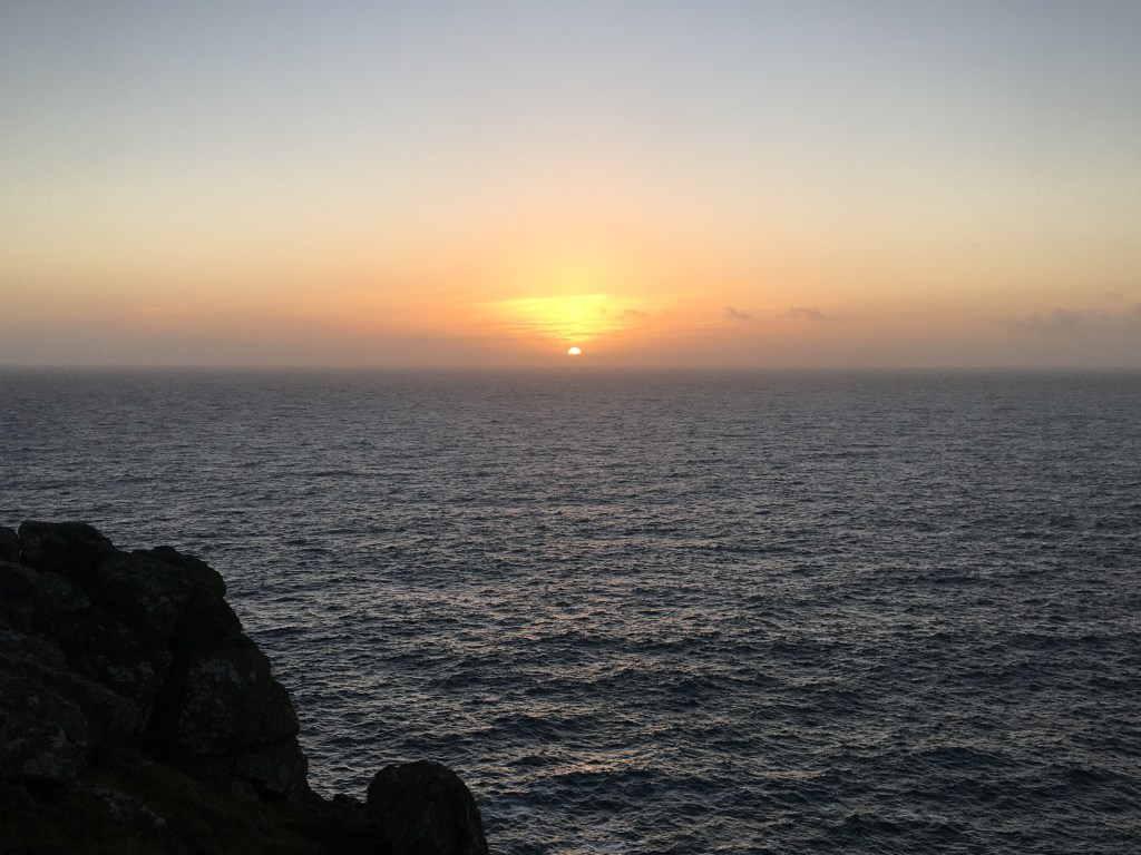 The sun is now a yellow smudge. It sinks into a bank of cloud that sits on the horizon. It creates a fan of light in the vapour. It’s getting cooler. I descend into coves, down steps and past rocks. Like many places before me. I try to recall the various points, hills and bays I’ve walked over. Portland Bill, Chesil Beach, Golden Cap, Lizard Point and so on and on. They are starting to fade in the memory.