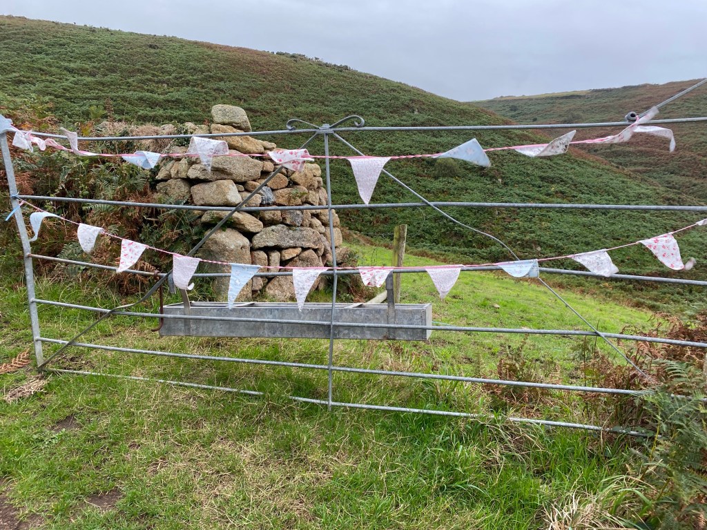 I pass the beach at Portheris which is abandoned today. Above the beach there’s some bunting left over from yesterday’s wedding flipping and flapping in the wind. I saw the bride, groom, bridesmaids in matching green and a few other guests walk down the cliffs to have their photos taken yesterday. It seemed like a scene from long ago.
