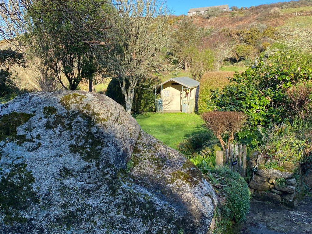 I come down a hill through a small plantation of bamboos to Treveal Mill, a beautiful grey house built next to a stream which splashes over rocks while a young black Labrador runs about barking excitedly. Little human touches here seem to sit well in the setting. There is a summer house with a sign on it saying ‘live life’.