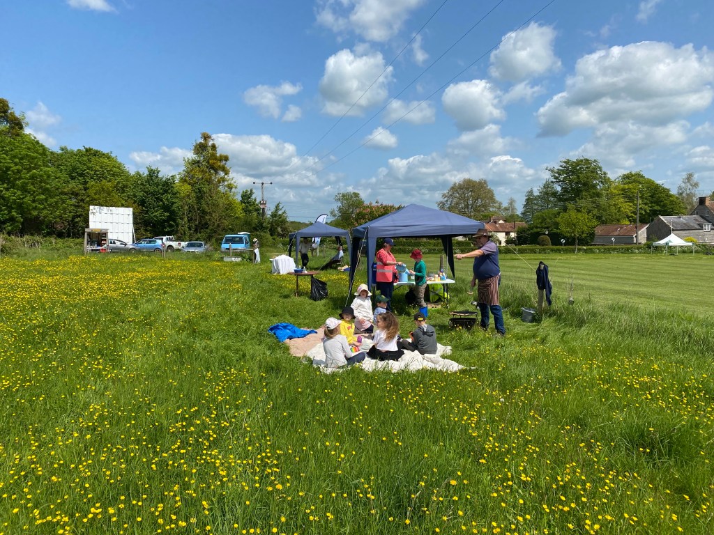 The children go from from one little station to another (under the gazebos) and get practical lessons on farming and wildlife. They start with wheat. Henry shows them where it’s grown and what it looks like. He tells us all to pick a stalk of young wheat and try chewing the bottom of the stalk. The group of seven boys look doubtful to begin with but then start to buy into it.