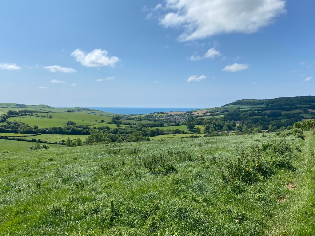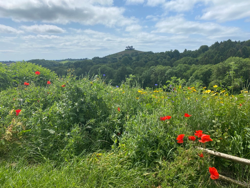 Here on the track to Axen Farm there is a seat made out of a tree trunk sawn in half lengthways to create a wide flat bench. I am looking over a bank of wildflowers towards the little copse on top of Colmer’s Hill and to the left – the south east – the sea and a ship a speck on the horizon. The flowers must have been planted deliberately, their impossibly bright blues, reds and yellows jaunty against the backdrop of the green of the Dorset hills. As I look towards the horizon something rises up indistinctly from the murky depths of my memory, something beyond description, which takes me back to being very young and driving and someone saying ‘Can you see the sea?’ Anticipation. Excitement. And something else I can’t quite put my finger on. Yes I can.