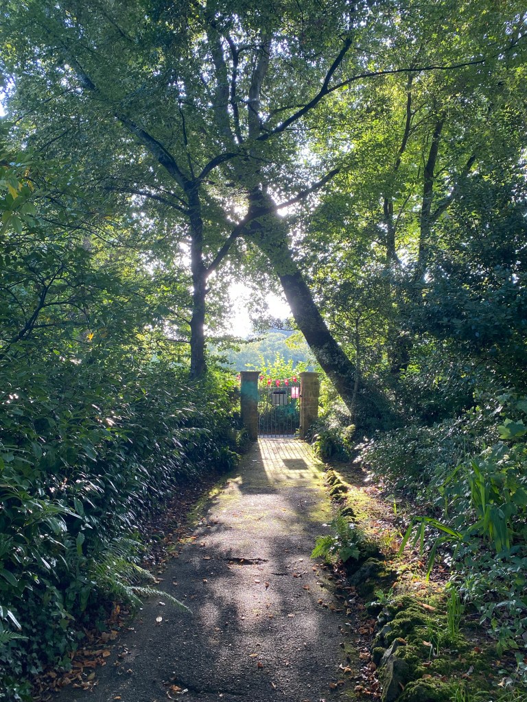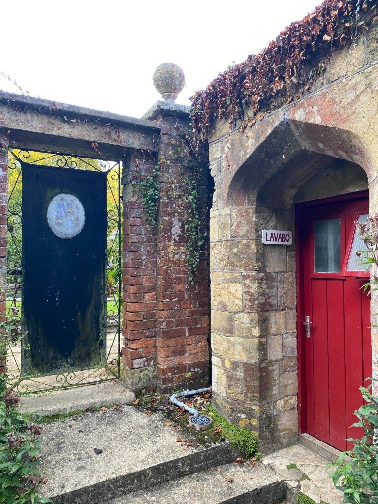 Through an iron foot gate a path leads through overhanging ash trees down to a church. The dip in the land and the framing of the trees and the coolness of the air create a sense of transition, a crossing over into a seemingly ‘other’ space, like entering a deep green pool. Grass borders the path and a wooden bench sits looking at the church porch. The path bends around to the left of the church front and stops at an arch with a red door with ‘Lavabo’ painted in red letters on a white wooden sign. Next to this a black metal gate built into the wall is a side entrance to the garden of Chideock Manor. From behind it I can hear the splashing of a fountain landing on stone and the excited shrieks of children jumping into a swimming pool.