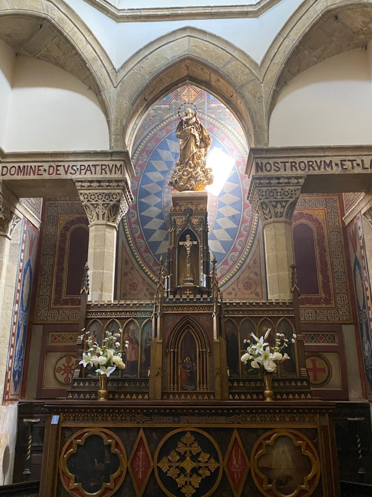 Inside my first impressions are of a well maintained church that one might see in a wealthy part of London. The nave is lined with beautifully carved arches above which are portraits of the martyrs. Beyond this lies the chancel wherein a Baroque statue of Our Lady is lit up by the sun streaming through the windows in the dome. One can’t help but imagine her rising up to heaven, on the day of her assumption being welcomed by the light of God.