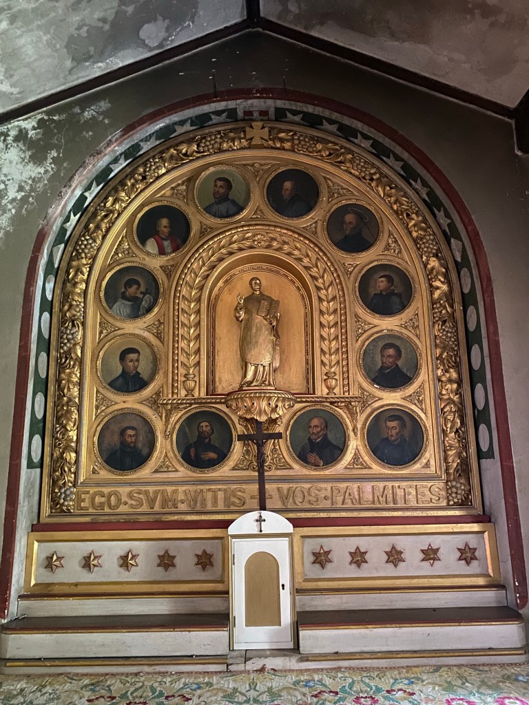 It seems like every feature has been thought of and designed with great attention the details. A wonderful altar sits in the south aisle of the church with a gold arch in which there are twelve portraits of men. Is this another tribute to the martyrs and if so why are there twelve men here?