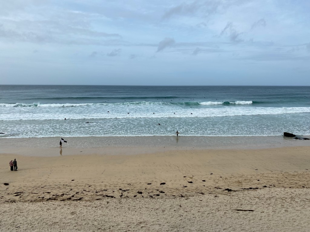 On the beach and in the beach cafe many people look on agog including the lifeguards in their high-vis orange uniform. On the balcony at the cafe two trophies are lined up on the rail which explains the quality of the surfing.