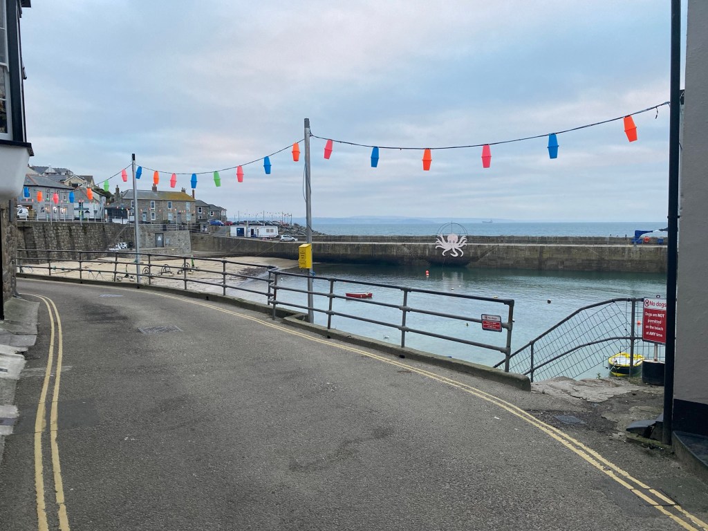 Yet there is a jaunty air to the harbour. The famous Mousehole harbour lights are still in place. Strings of bright blue and orange lanterns adorn the road that rings the harbour. A cartoonish, pink Octopus uncurls its tentacles on the side of the sea wall. And on the beach an enormous dragon made out of wood and painted boards lies on the beach while eight men in high vis jackets stand around it waiting to carry it up the sea steps until next year. In the background the long line of The Lizard is a thin blue band between the sea and the sky.