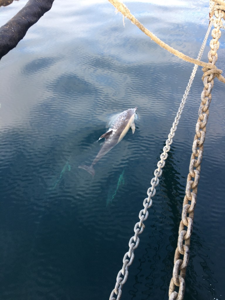 It’s precarious. There’s a clutter of ropes, sails and wires. I climb over the bow onto the ratlins, the ropes that connect to the bow sprit meant for walking on not looking at the water beneath my feet or even worse imagining what would happen if I fall in and get mown down by a 100 foot ketch.