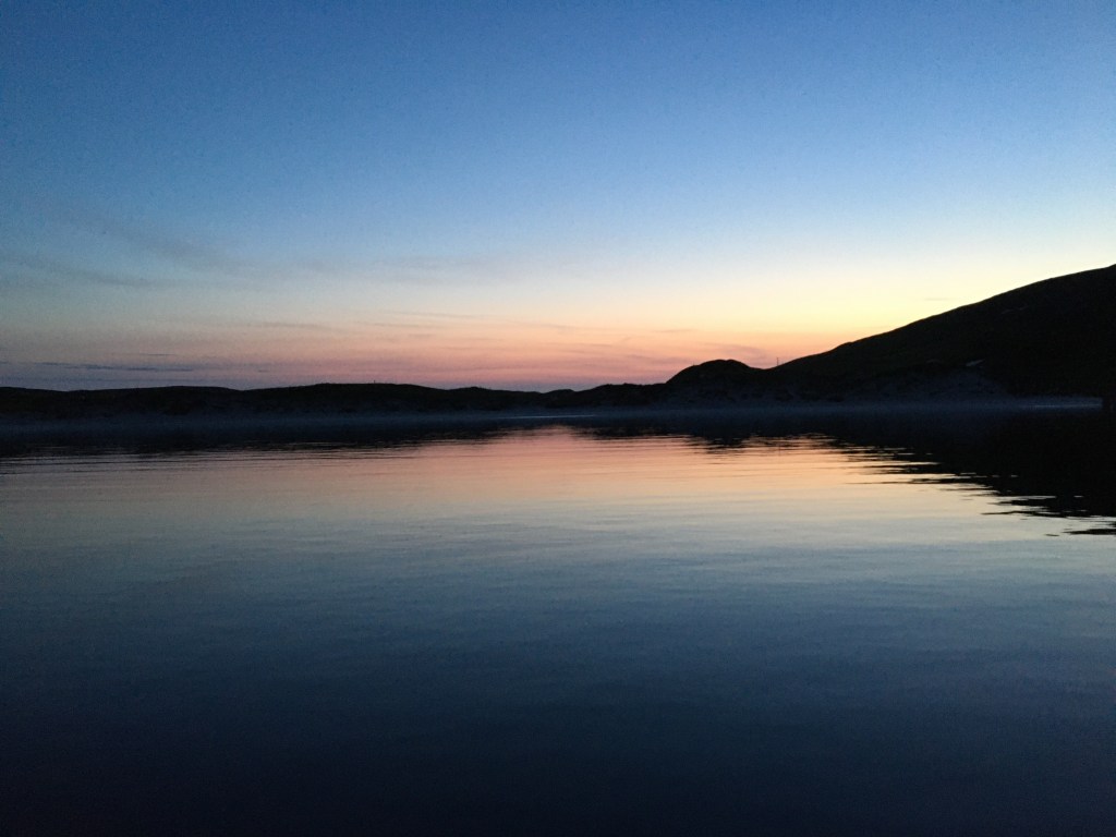 It’s overcast and still. A sea otter is in a bay a few hundred metres away. You can see his head pop out of the water, bob around a bit and then his sleak back arches as he dives. The last thing to disappear are his pad shaped feet. We see him come up several times and calmly paddle, just his head visible. Suddenly the glass of the surface is shattered by tiny fish scattering. Calm on the surface but clearly active beneath.